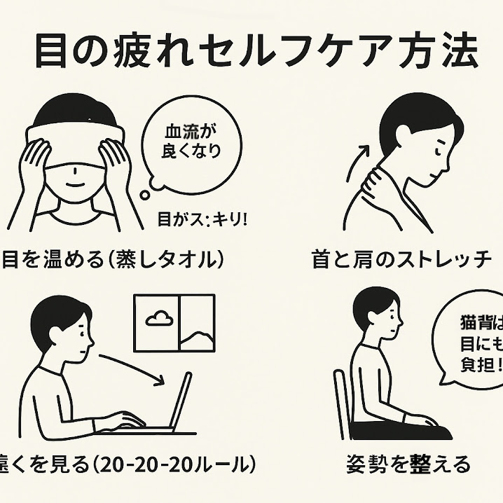 特に、首や肩まわりの緊張を緩めることで、目のまわりの血流もスムーズになり、スッキリ感を感じやすくなります。