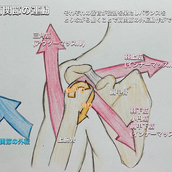 例えば、肩を上げる時、上腕骨と肩甲骨の衝突を避けるために、肩の関節は下に「滑り」ながら、骨頭が「転がり」動いています😁